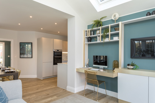 The showstopping open-plan kitchen and dining room has several functions and includes a striking sage kitchen, stylish dining area and a compact office desk.