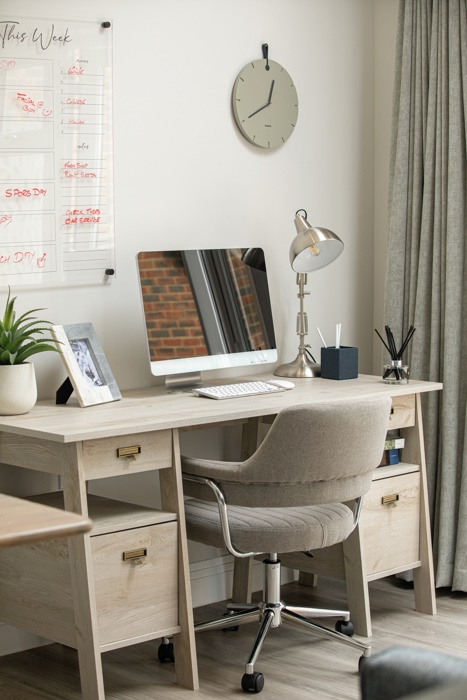 The right lighting is crucial for any office, no matter where it’s located in your home. Good lighting serves two purposes: it helps maintain focus and keeps you in the right frame of mind for work, while also protecting your eye health. If possible, place your desk near a window. Natural light not only boosts concentration but also ensures you get some much-needed vitamin D. Ceiling lights are ideal, especially in the winter months when days are shorter. Additionally, a standard or desk lamp with a warm bulb can create a cosy atmosphere, reducing eye strain when reading small print, books, or working on your computer.