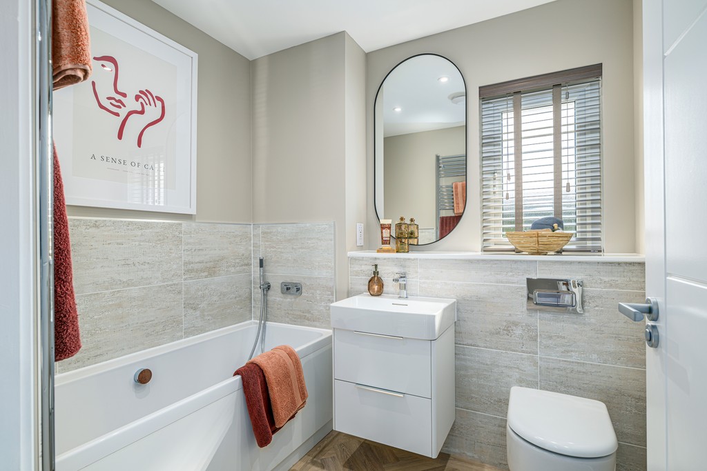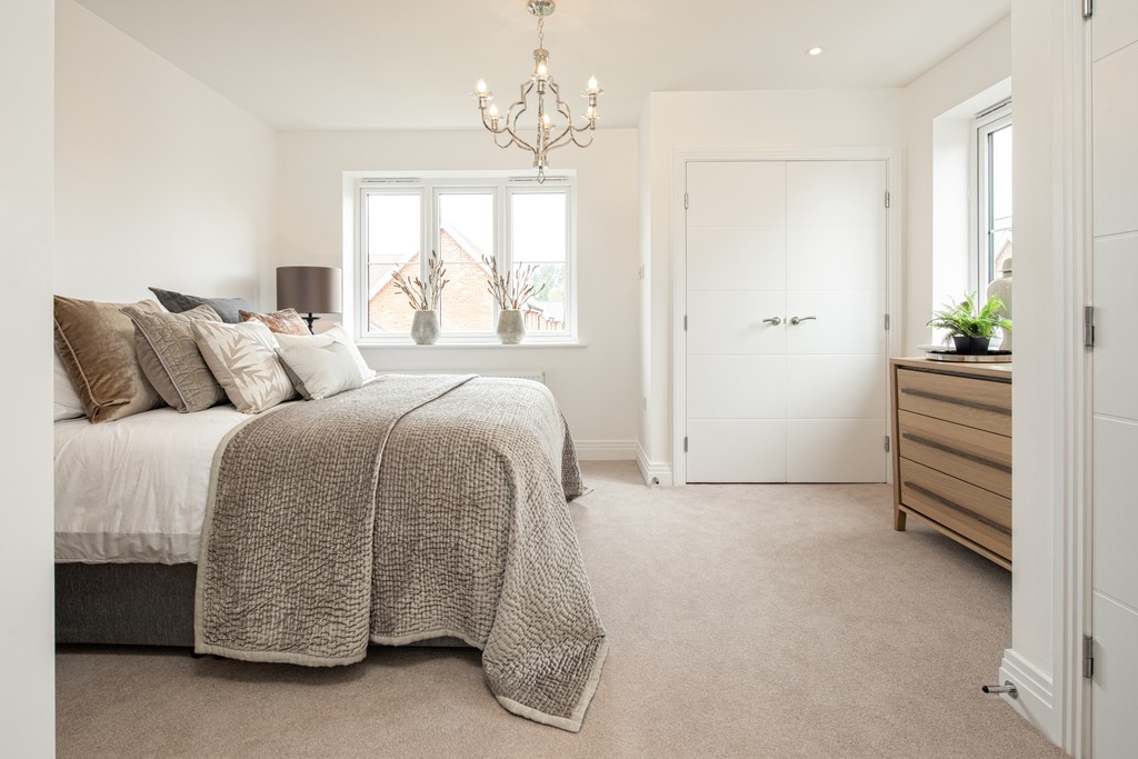 On the ground floor, an expansive kitchen/ dining room stretches the width of the home and opens out into the garden for safe play or entertaining. There’s a separate study which could double as a cinema room, playroom or den, while the spacious, dual aspect sitting room on the first floor is flooded with natural light. Light-filled, dual aspect Bedroom 2 is located on the other side of the landing and features a built-in wardrobe, and there is a shared family bathroom opposite the stairs.