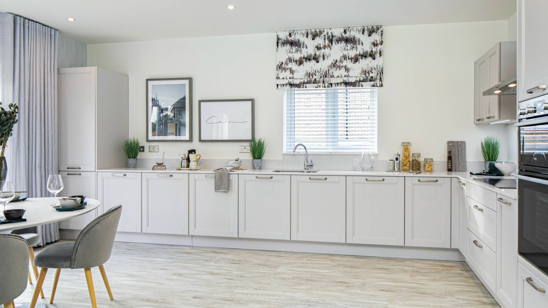 There’s the large sitting room with bi-fold doors to bring the outside in, as well as a formal dining room. The open plan kitchen/family room is complete with a generous L shape kitchen and two sets French doors.