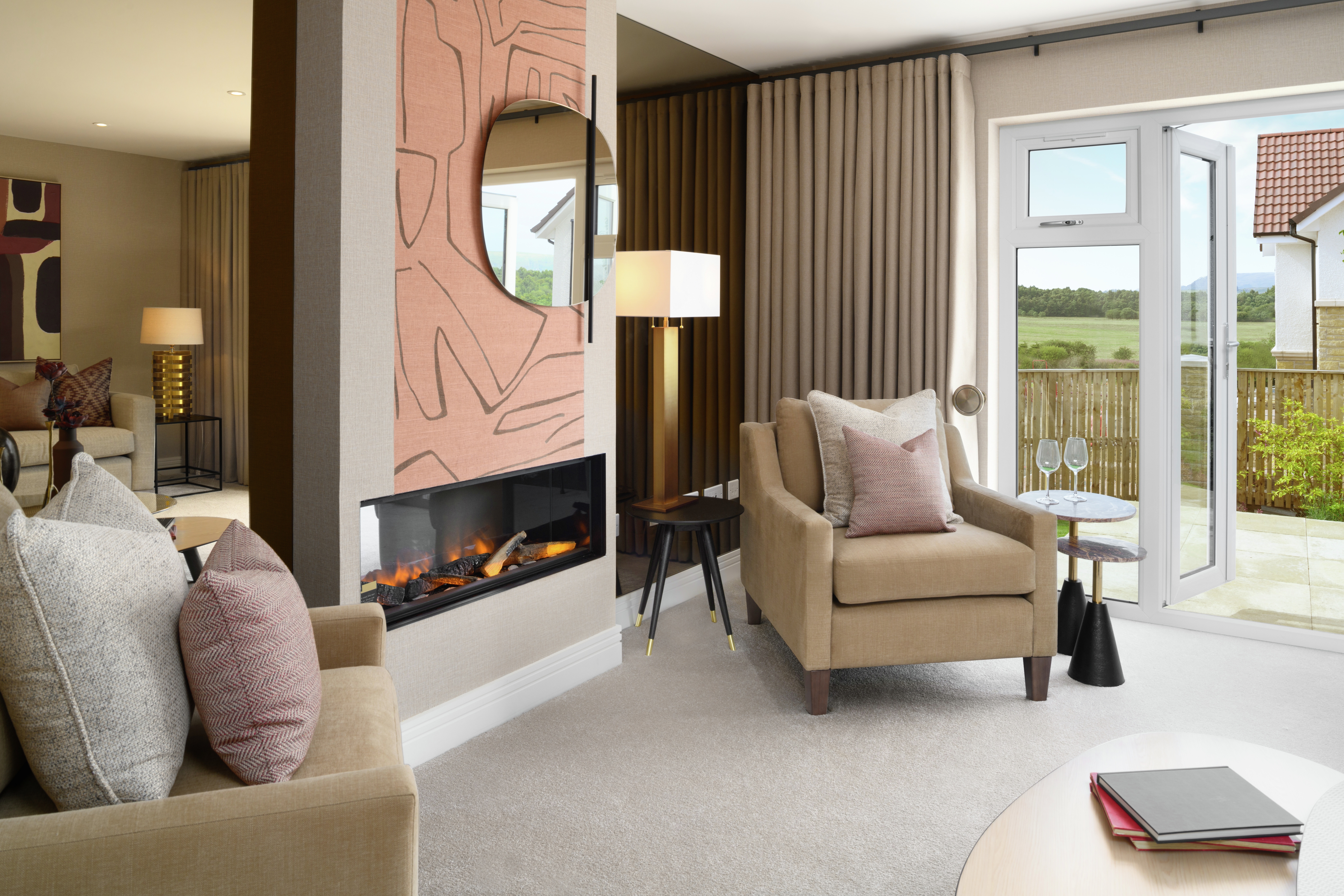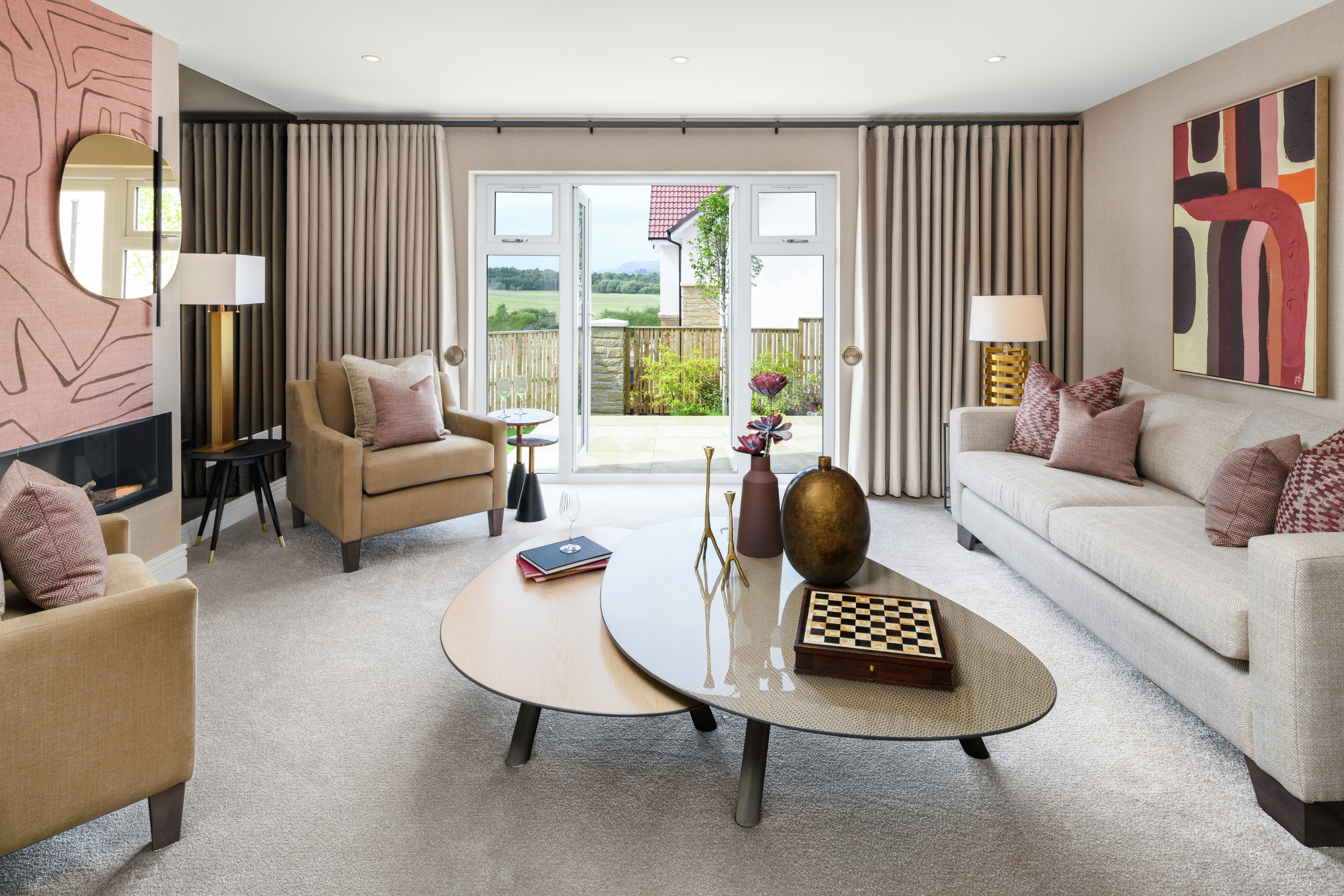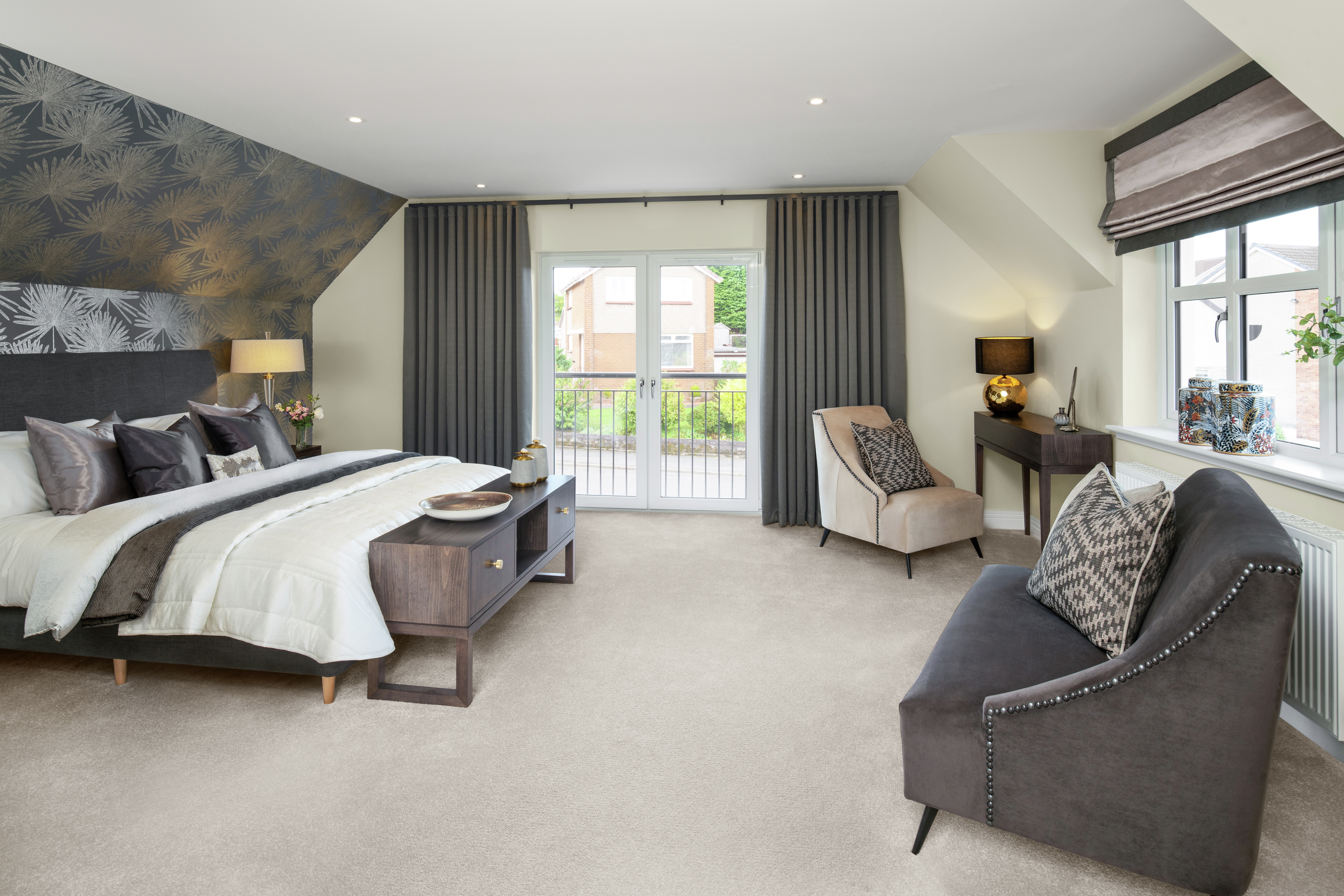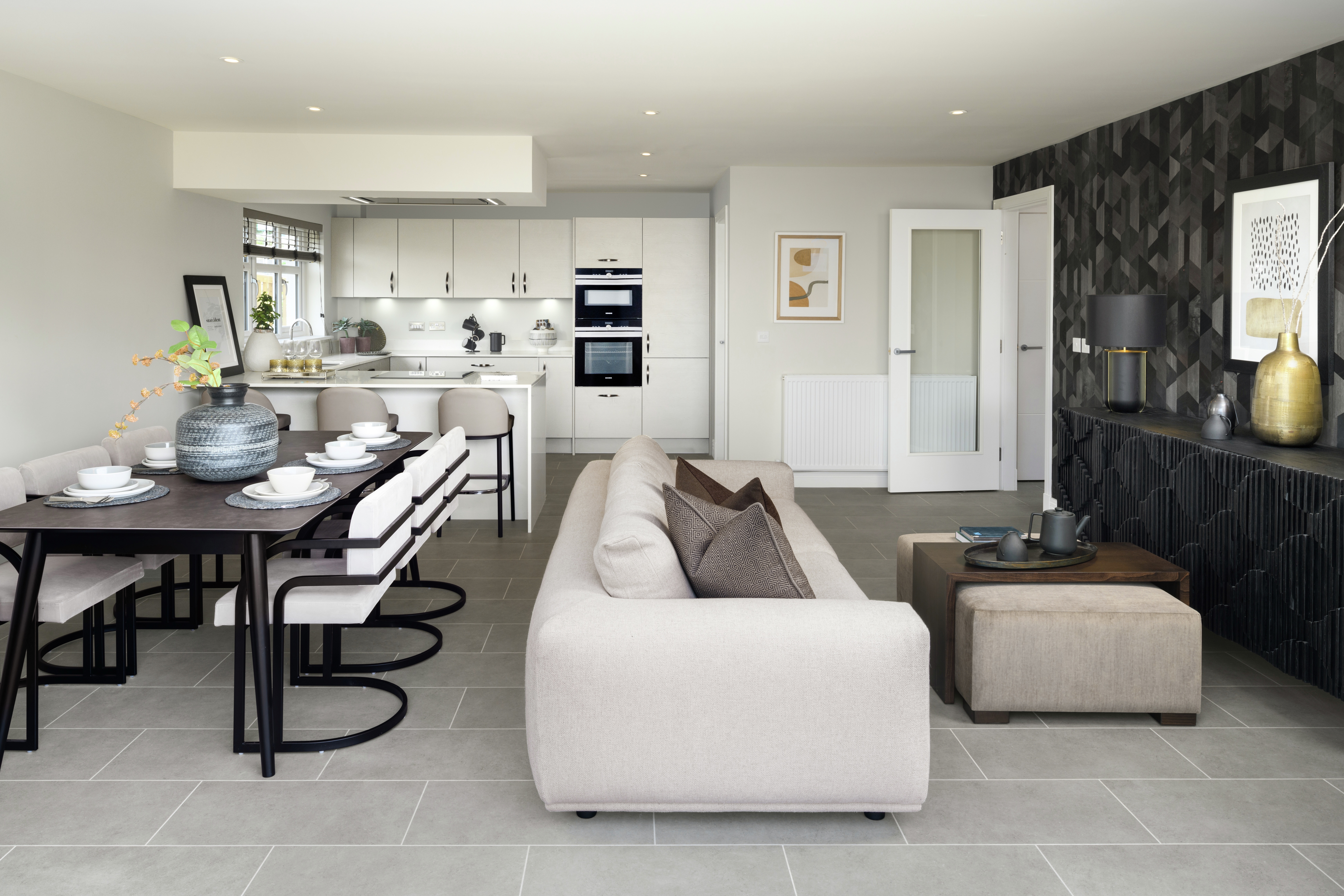 The Dewar is a spacious L-shaped, five-bedroom detached home designed for flexible family living. On the ground floor, a welcoming hallway leads to a formal lounge and an impressive open-plan kitchen, dining, and family room —both opening onto the rear garden via contemporary bi-fold/French doors. The stylish kitchen by Creative Designs features integrated Bosch appliances and peninsula island, perfect for entertaining or informal dining. A utility room, storage spaces, and a WC complete the downstairs.