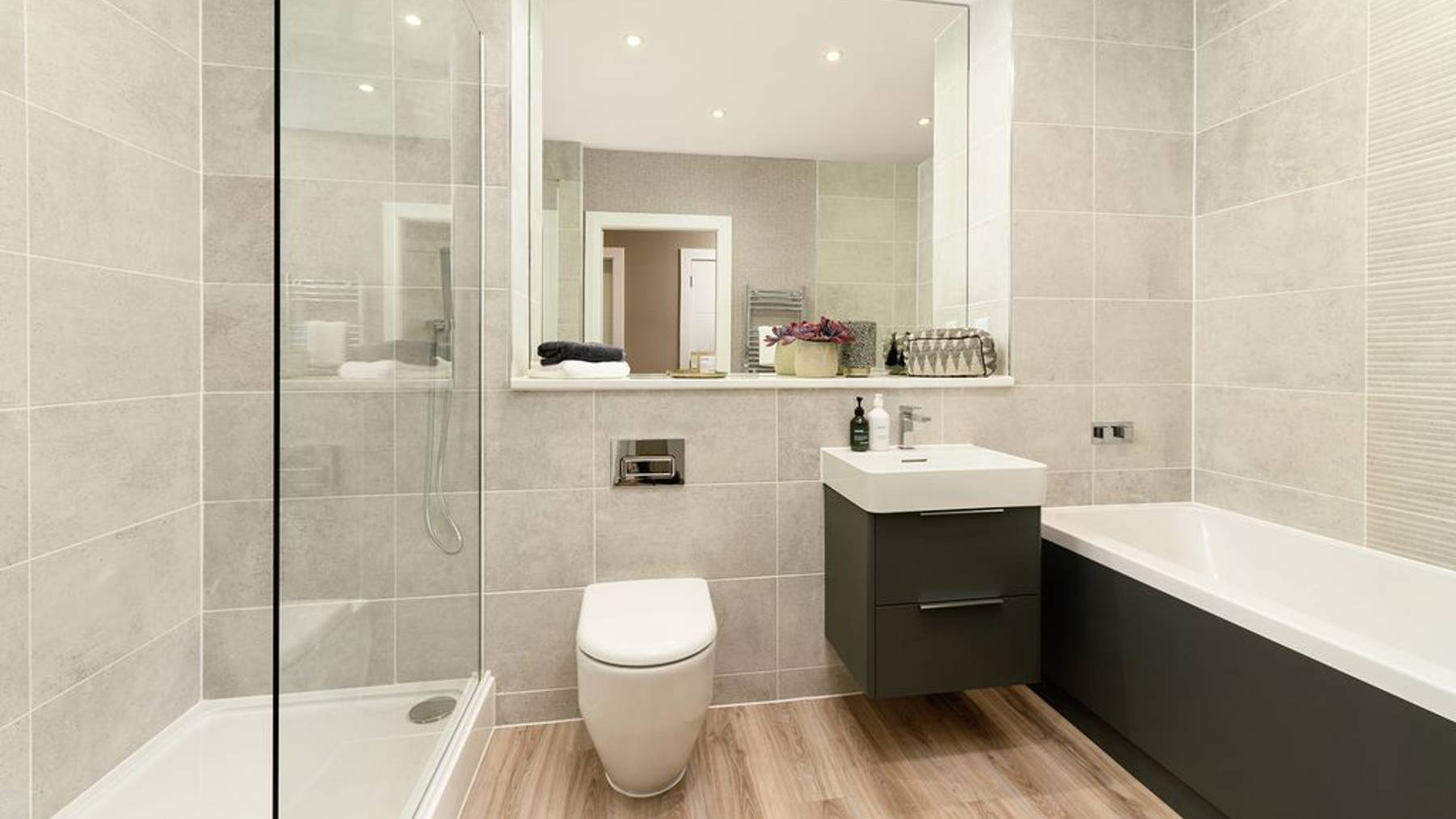 The sizeable bedroom is West facing for plenty of natural light, and features sleek fitted wardrobes whilst a contemporary designer bathroom offers a delightful space to unwind.