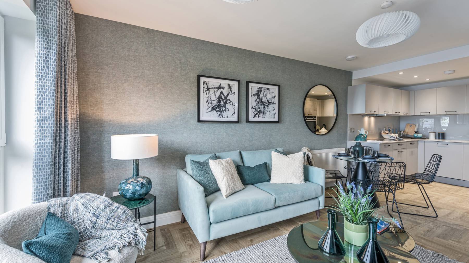 The open plan living space is thoughtfully set back from the L-shaped kitchen to create a segregated open plan layout. The designer kitchen by Creative Designs benefits from integrated premium Bosch appliances and ample countertop space for cooking your favourite meals.