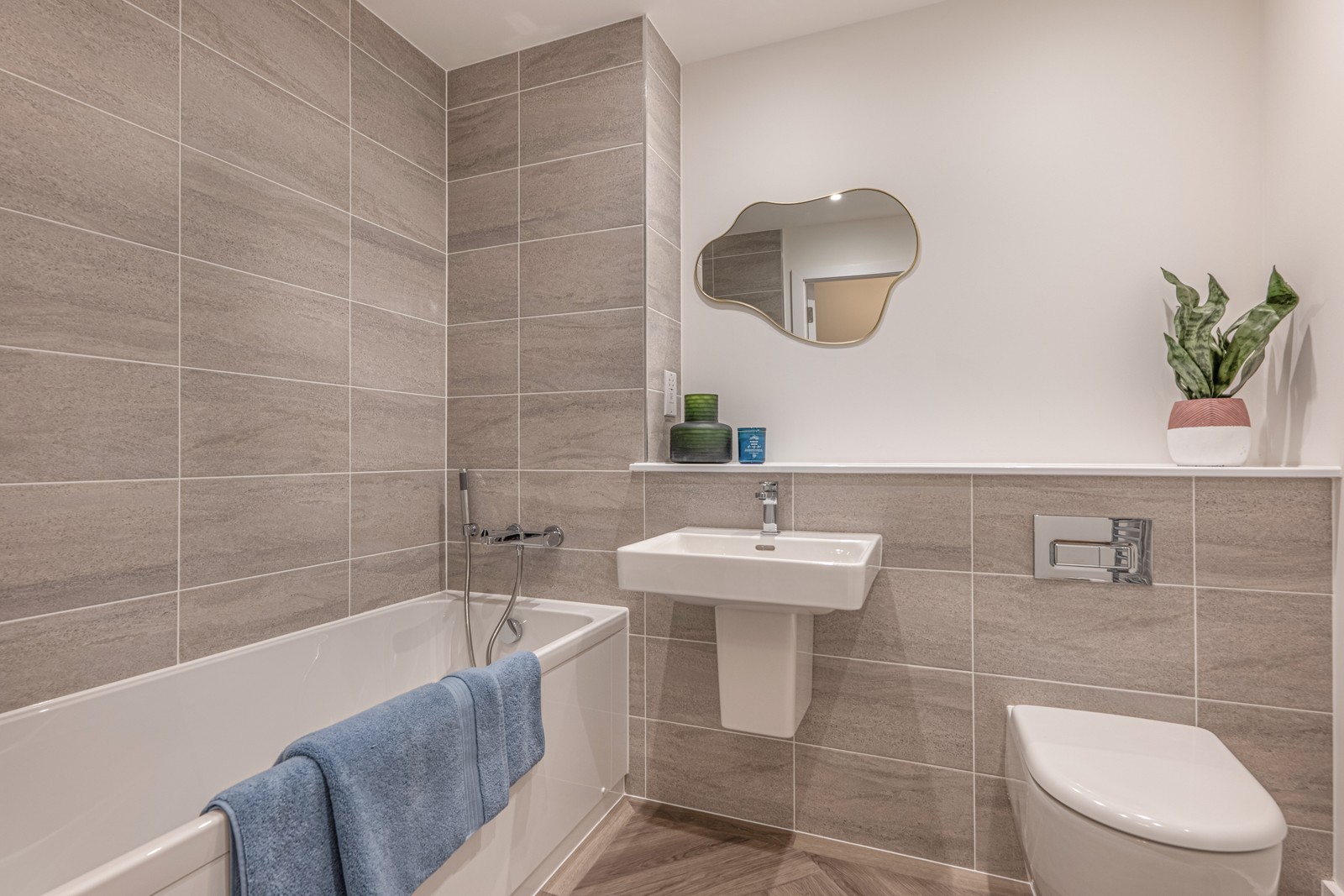 The main bathroom features contemporary sanitaryware and a chrome heated towel rail. This apartment combines comfort and convenience in one of Glasgow’s most desirable southside locations.