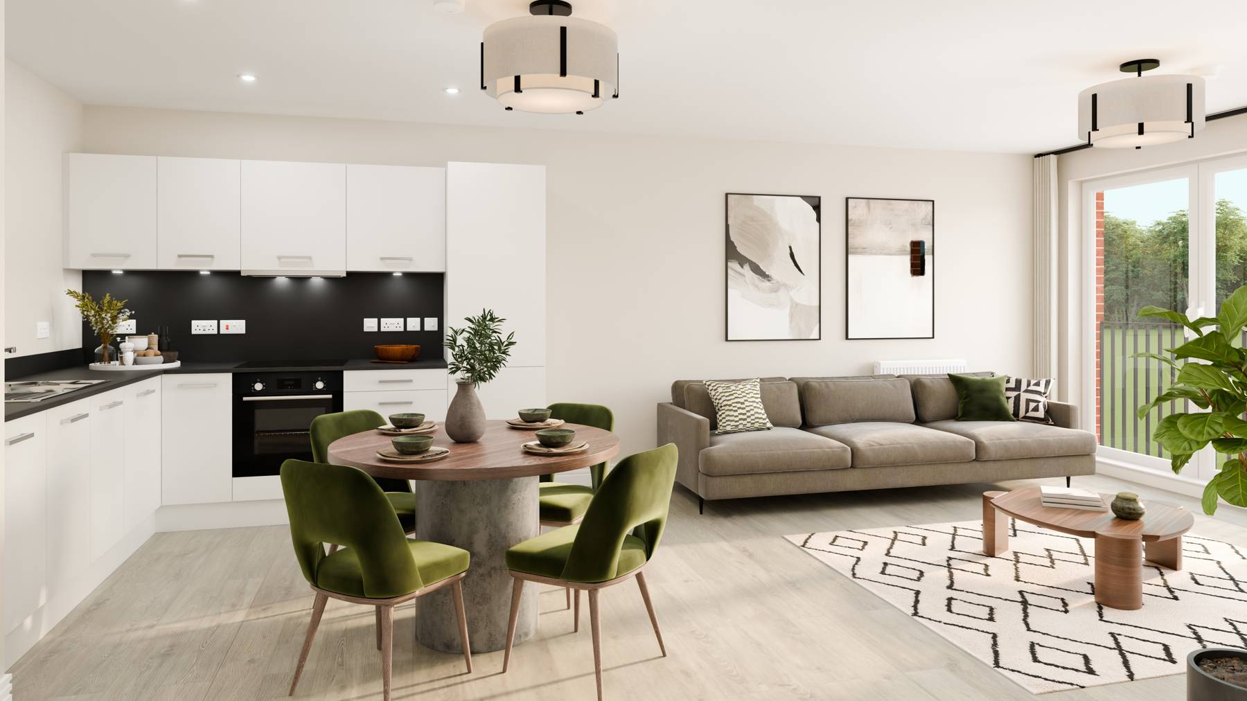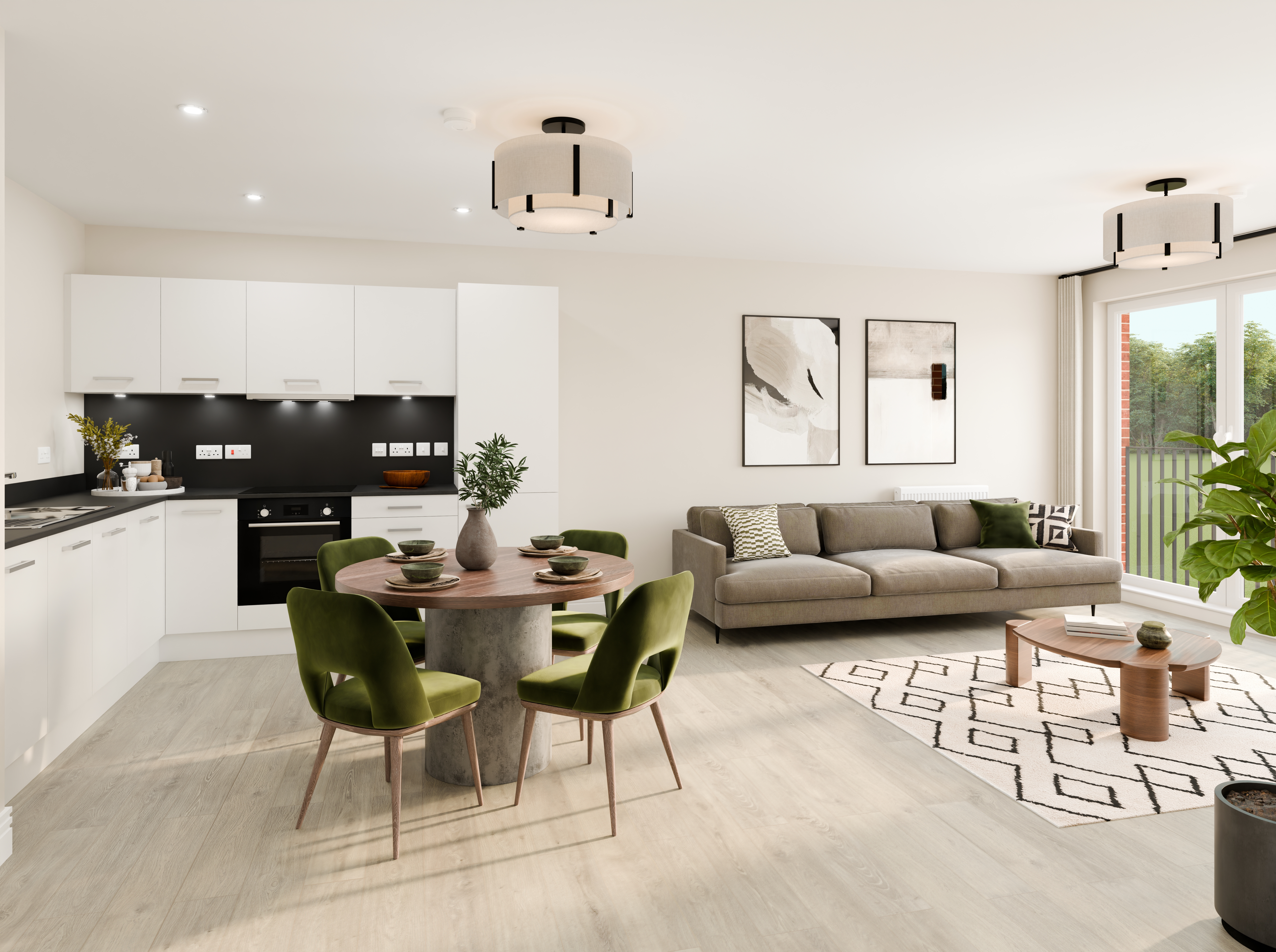 This one-bedroom apartment offers an open-plan living space with a functional L-shaped kitchen and direct access to a private balcony, ideal for relaxing or entertaining.