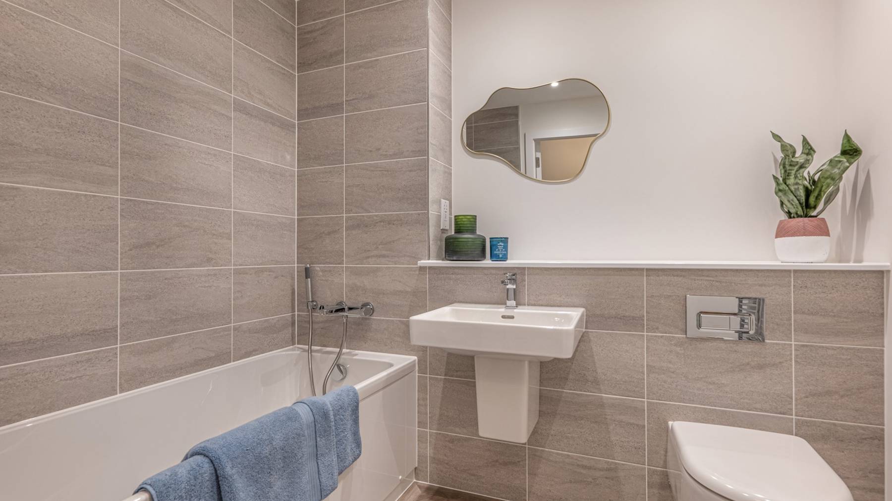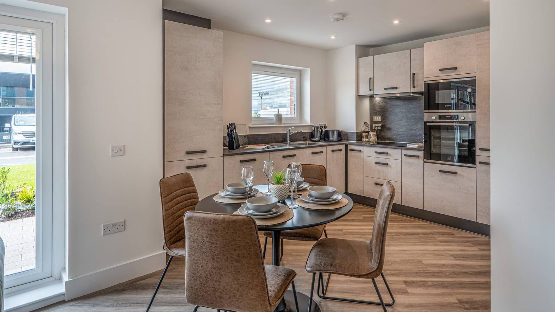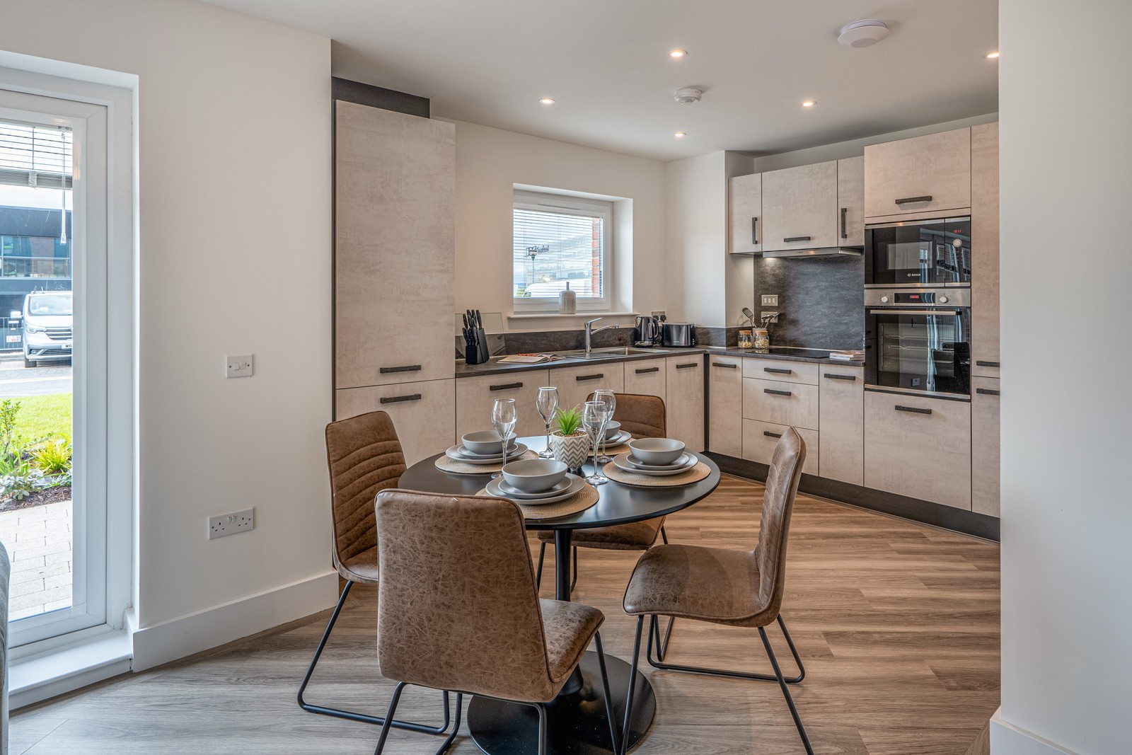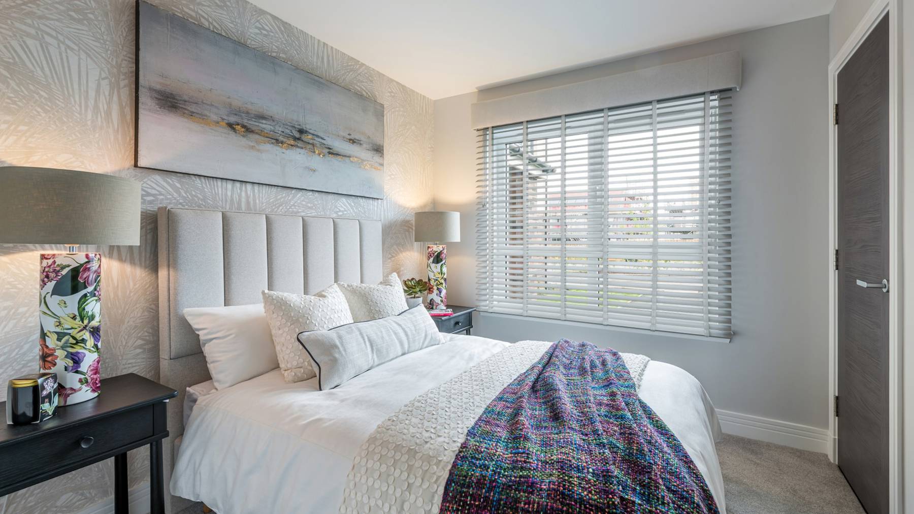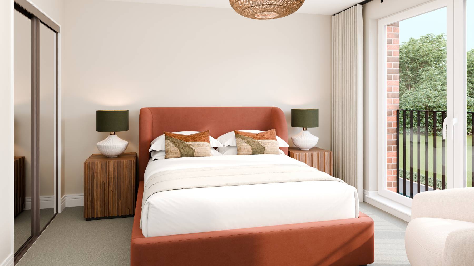 The impressive open-plan living space is complemented by a walk-out balcony which overlooks the developments’ communal gardens and green spaces. The designer kitchen by Creative Designs features integrated Bosch appliances creating a sleek and modern finish.