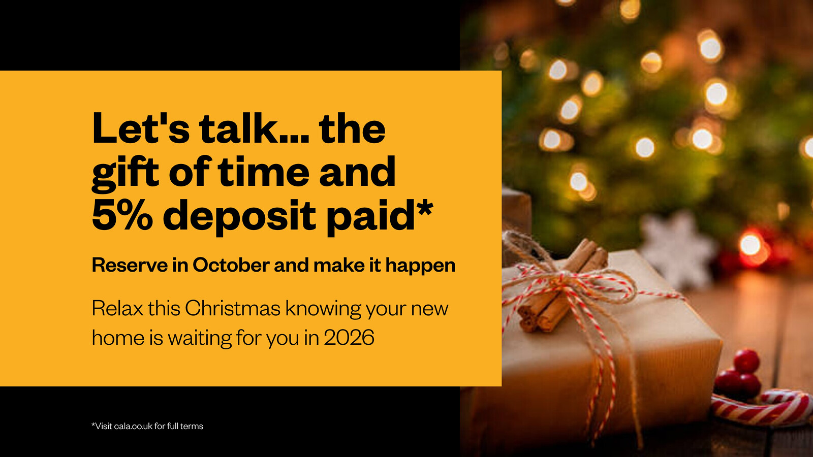 Get ready for the best Christmas ever, knowing you’ve secured a quality new Cala home with a 5% deposit payment* covered by Cala, when you reserve by 31st October 2025.