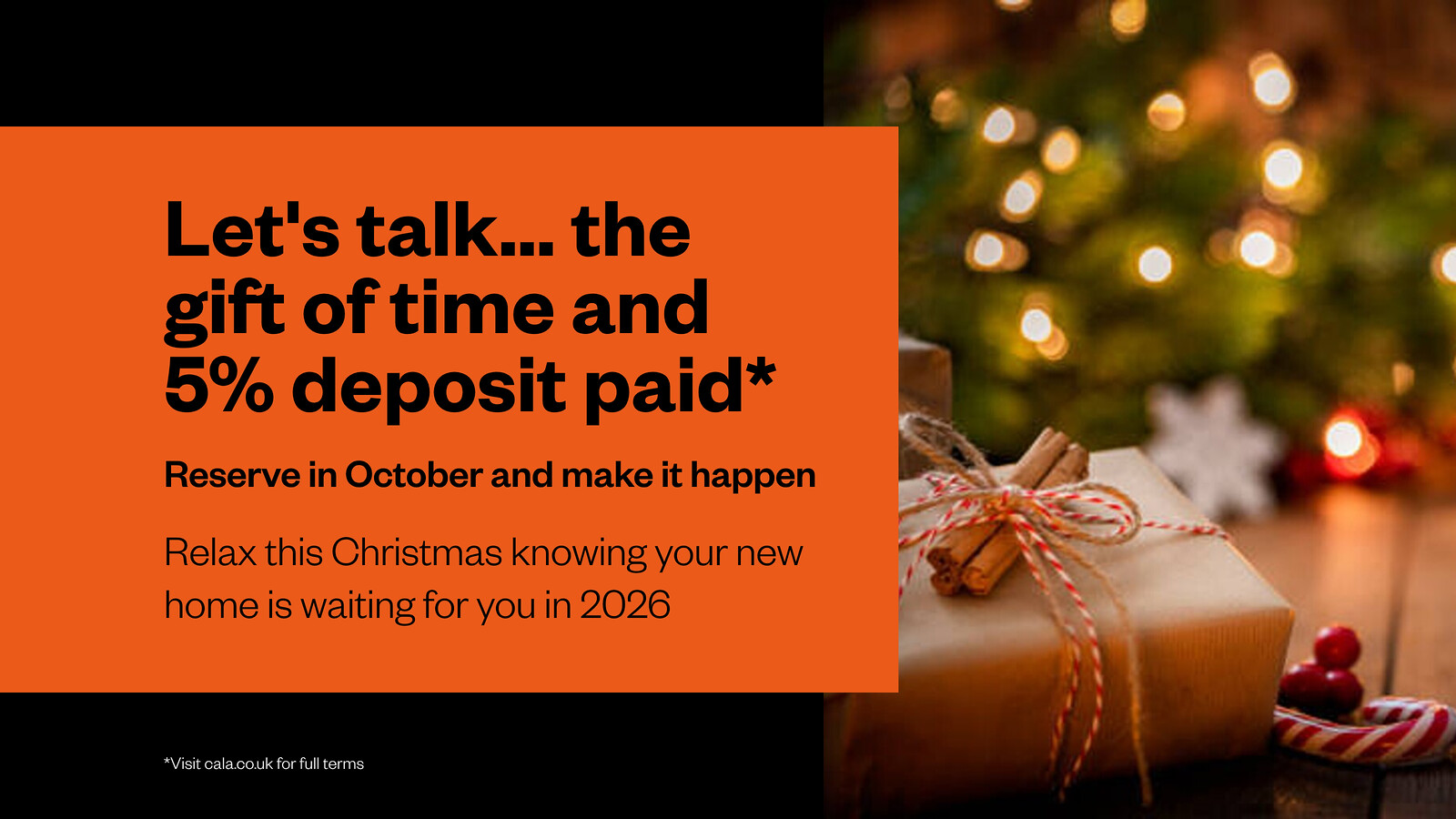 Get ready for the best Christmas ever, knowing you’ve secured a quality new Cala home with a 5% deposit payment* covered by Cala, when you reserve by 31st October 2025.