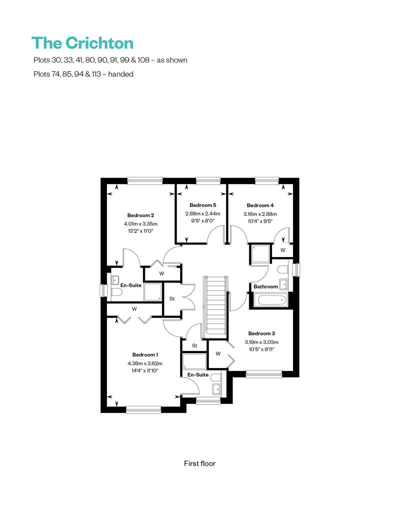 Four double bedrooms, two with en suite, plus a flexible fifth bedroom/study make The Crichton a family home with room to grow. The four larger bedrooms feature fitted wardrobes, and all rooms have access to a luxurious family bathroom.