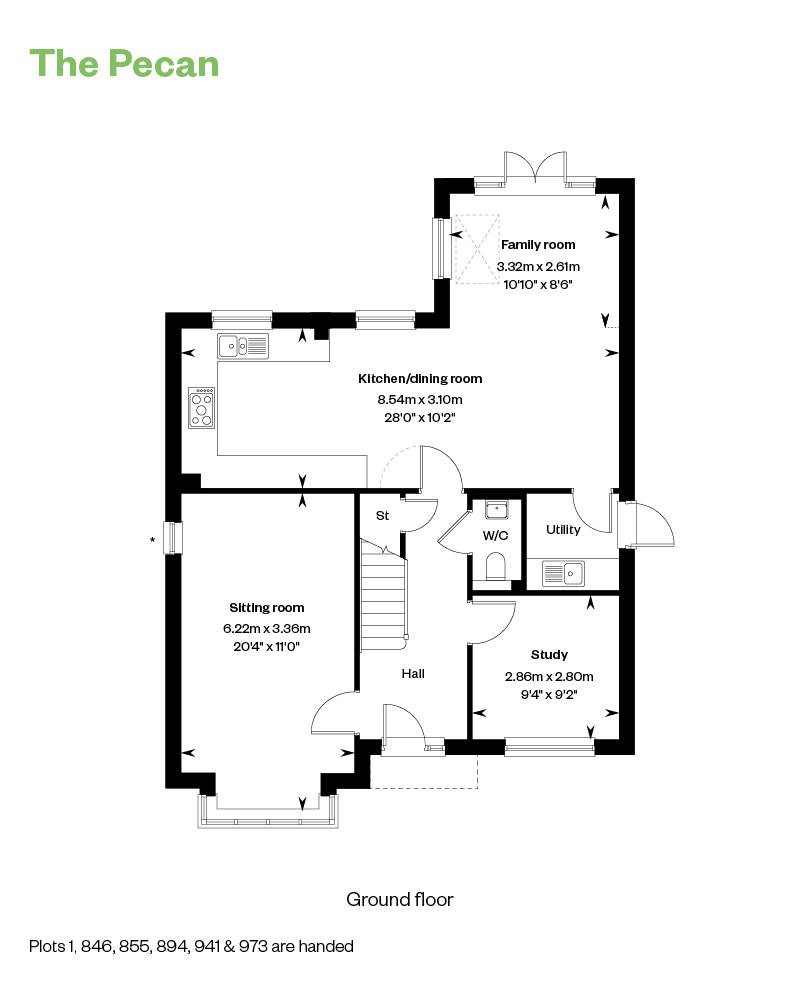 The stylish and spacious 4 bedroom Pecan is perfect for larger families, thanks to its generous dimensions and sheer flexibility. The impressive living spaces steal the show on the ground floor, with the light-filled, front-facing sitting room ideal for bringing the whole family together. The expansive, dual aspect kitchen/dining room and family room with integrated Bosch appliances, meanwhile, is just the place for entertaining, and brings the outside in, courtesy of the French doors that open out to the turfed garden. There is also a handy utility room, w/c and a private study.
