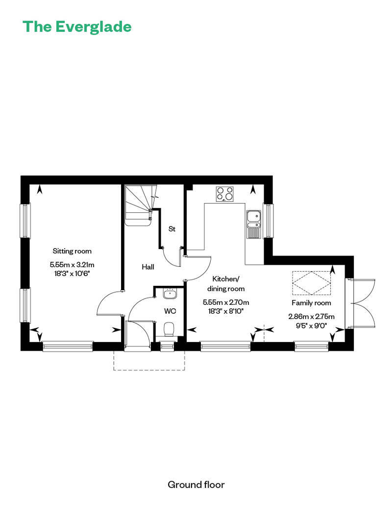 Two enticing options present themselves on entering The Everglade. Will you explore the large sitting room, dual aspect and running the length of the home? Or will you get acquainted with the spacious kitchen/dining/family room? With its set of French doors leading out to the garden, this flexible interior will have your cooking, family meals and playtime covered.