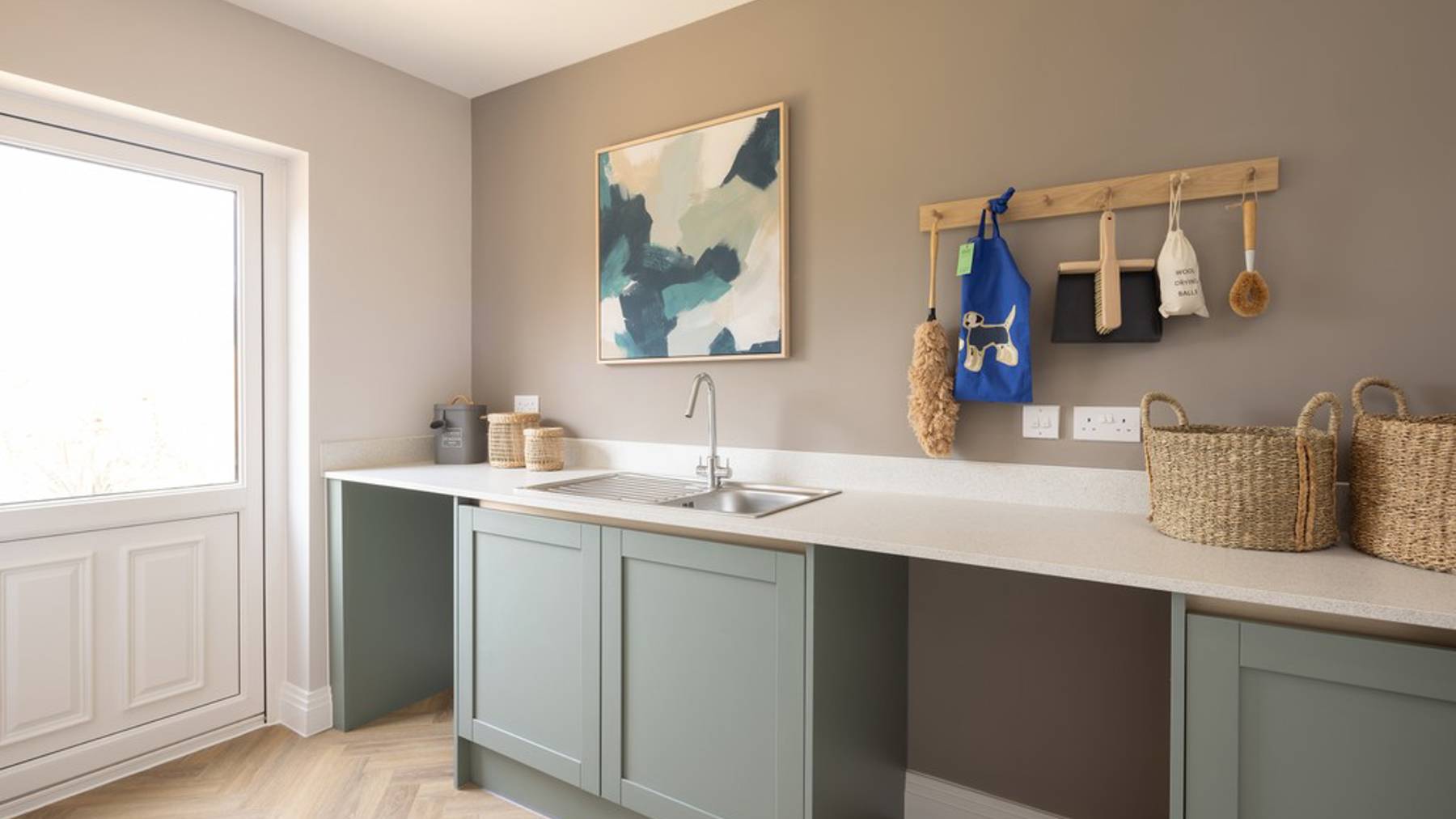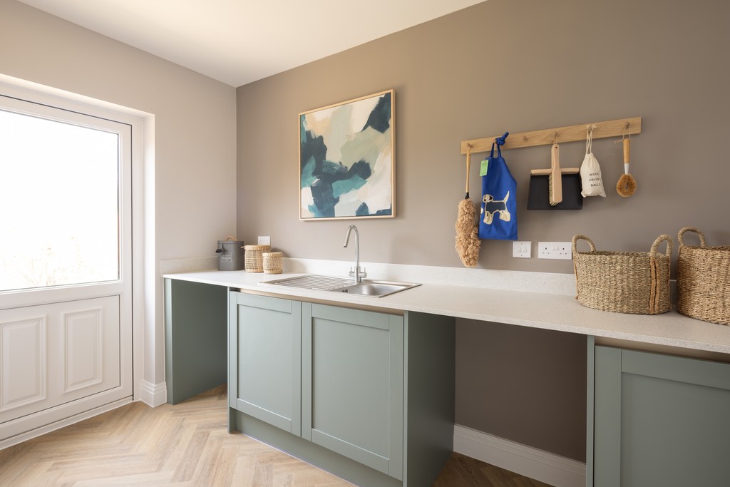 To the rear of the home is an expansive kitchen / dining / family room filled with natural light thanks to two sets of bi-fold doors which open into the garden. Thoughtfully designed living space with a kitchen island and family living, ideal for indoor-outdoor living. A seperate utility room sits just off the kitchen with a patio door leading into the garden.