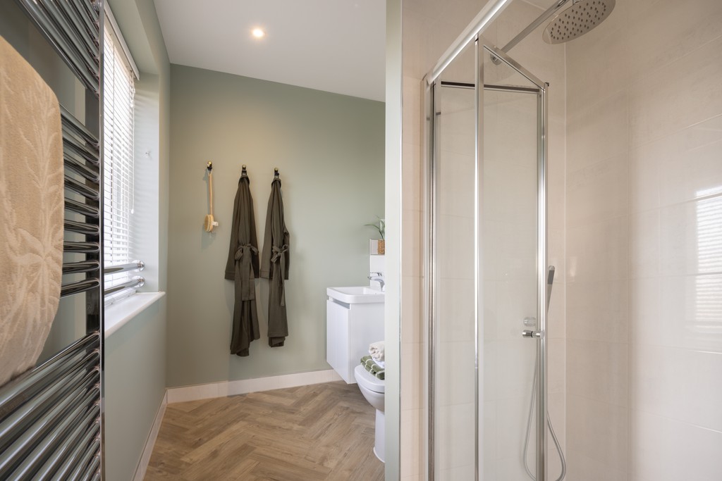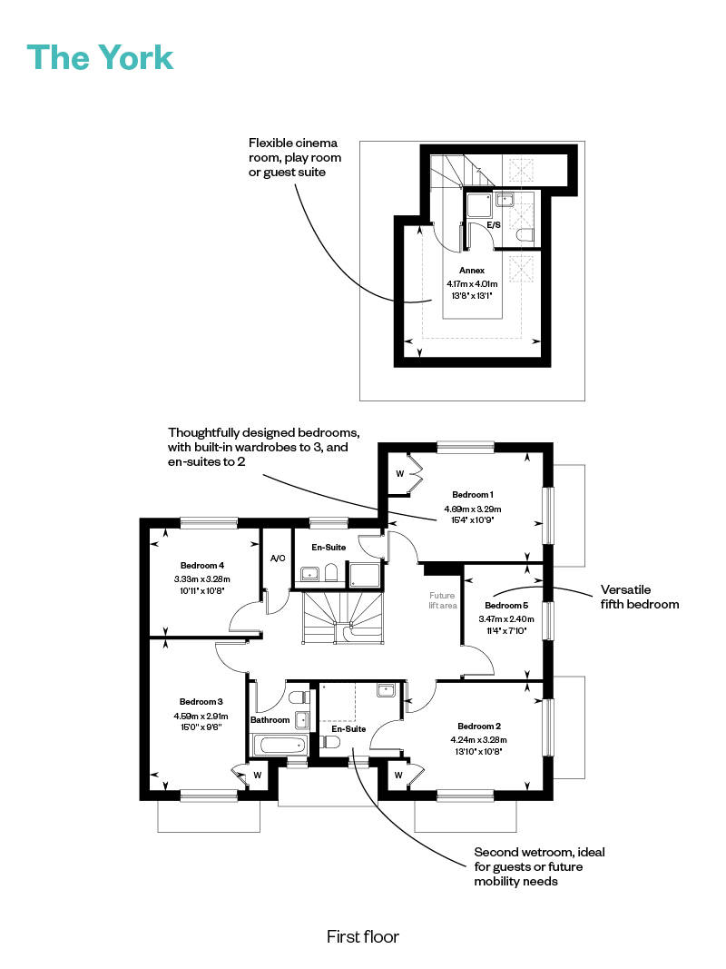 The York is a home for life: specially designed to meet M4/3 accessibility standards and adapt to your needs as life changes. There are wider doorways and step free access to the front door and garden, a ground floor wetroom, two storage cupboards, a dining room, study and double-aspect sitting room which opens into the garden via bi-folding doors. The kitchen / family room is triple-aspect with bi-fold doors outside, and a separate utility.