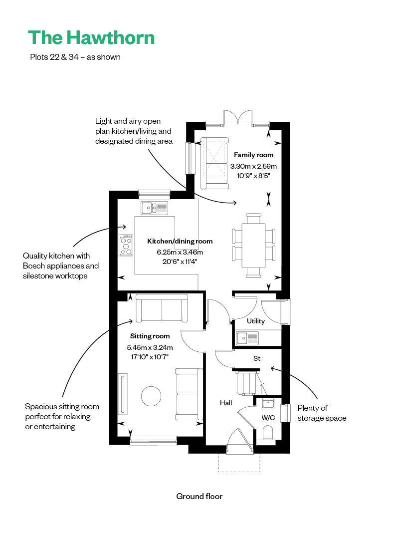 The Hawthorn benefits from an impressive square footage. The front-facing, light-filled sitting room is the perfect haven, while the substantial, open plan kitchen/dining and family room is ideal for entertaining, and opens out to the lawned garden through a set of French doors. There is also a handy utility room.