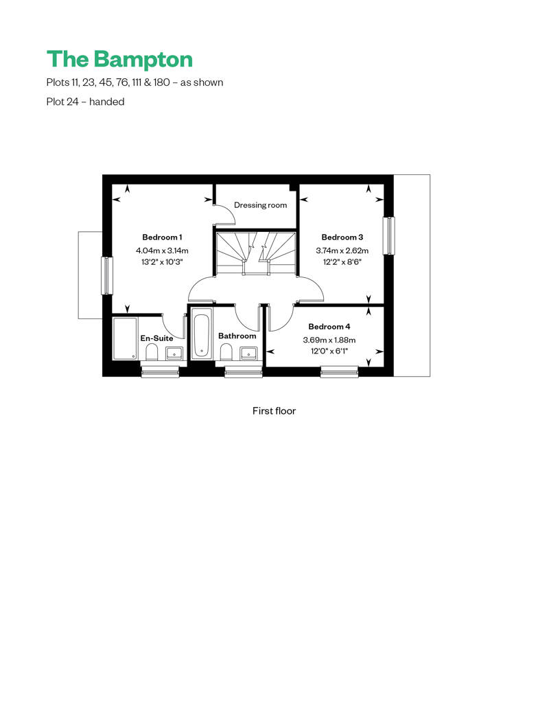 There are four bedrooms in total, with three on the first floor, including Bedroom 1 with an en-suite and a dressing room, as well as a family bathroom. The second floor features a spacious double bedroom with ample storage, a separate shower room, and a study.