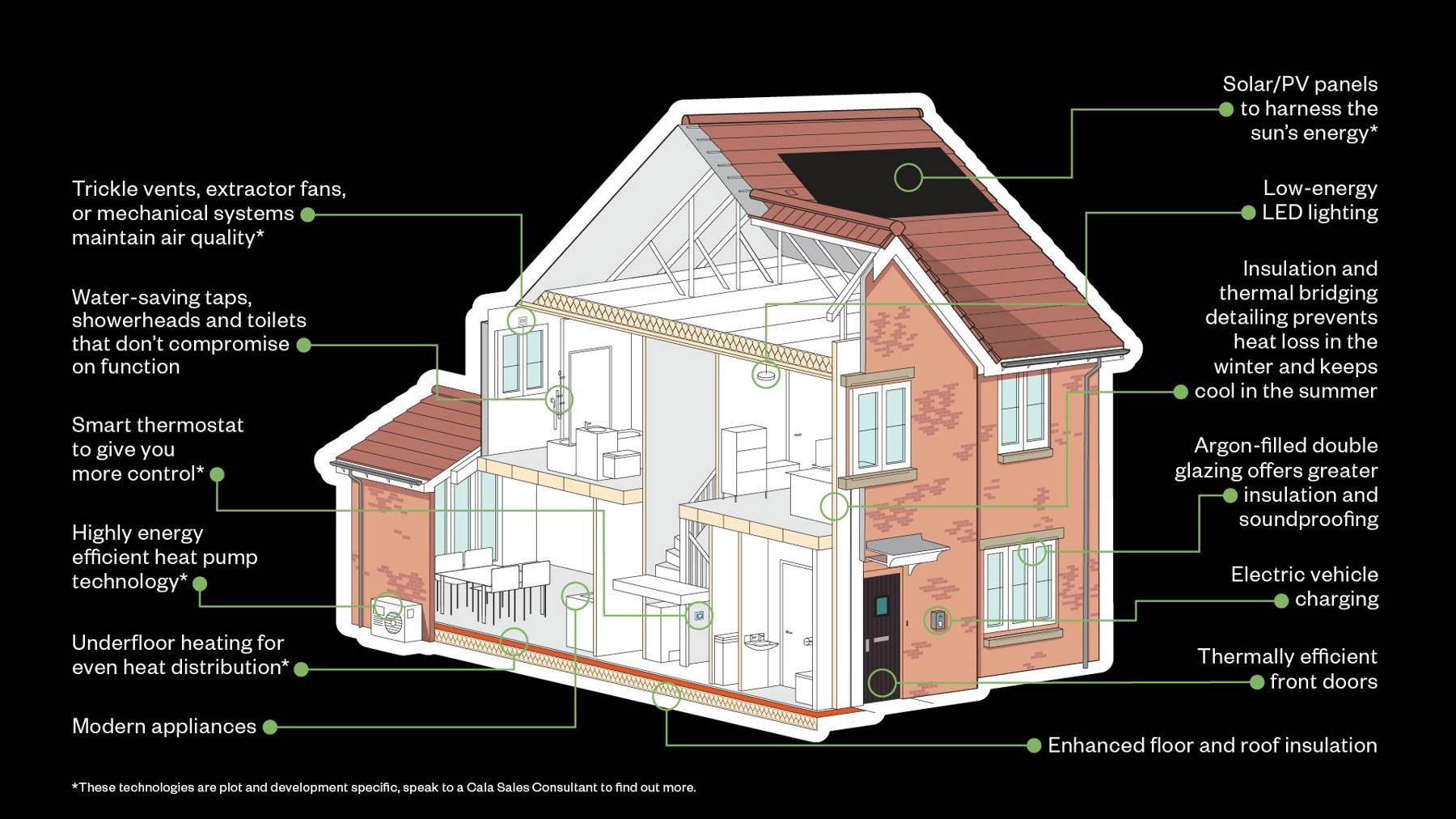 Cala is transitioning to gas-free heating systems such as air and ground source heat pumps. In these instances, the radiators we use are sized to suit a low-temperature heating system to ensure they run more efficiently. Where our developments remain on gas, our customers will benefit from A-rated gas boilers to minimise energy use and wastage. Many of our homes feature smart heating thermostats to give you better control over your energy use.